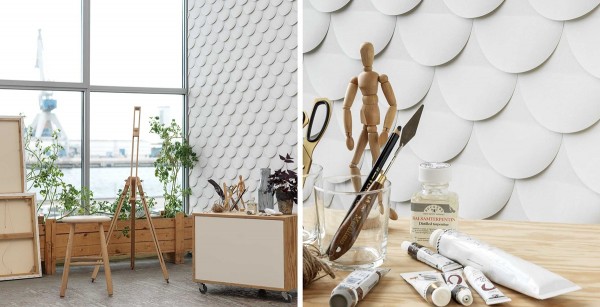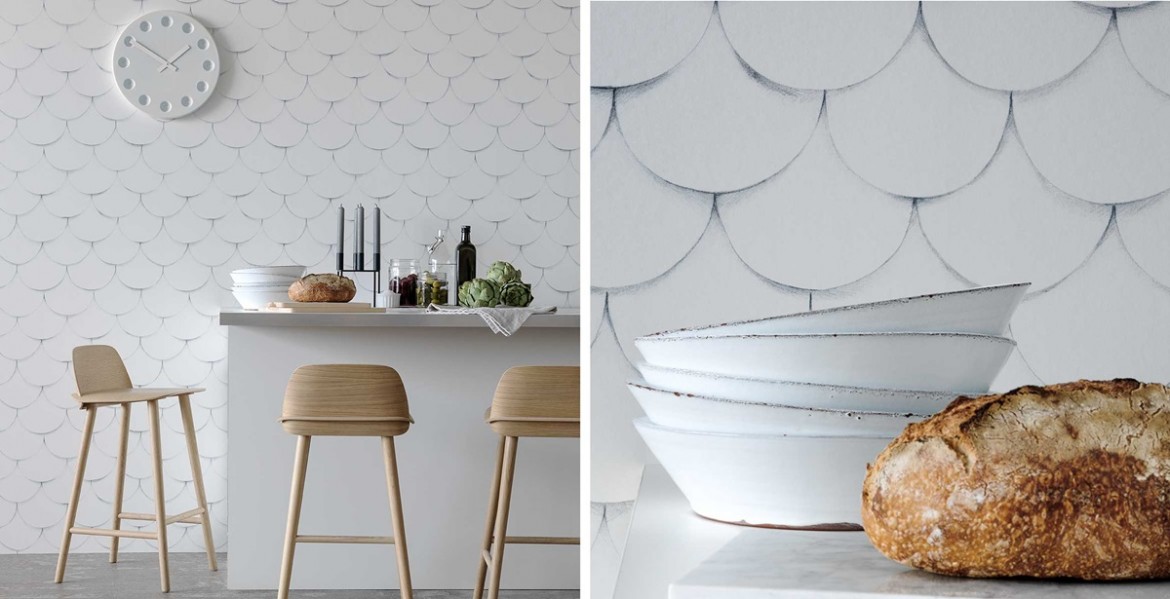 Front består av nio stycken tapeter med tecknade mönster och skuggor mot vit yta som skapar en illusion av djup och struktur.