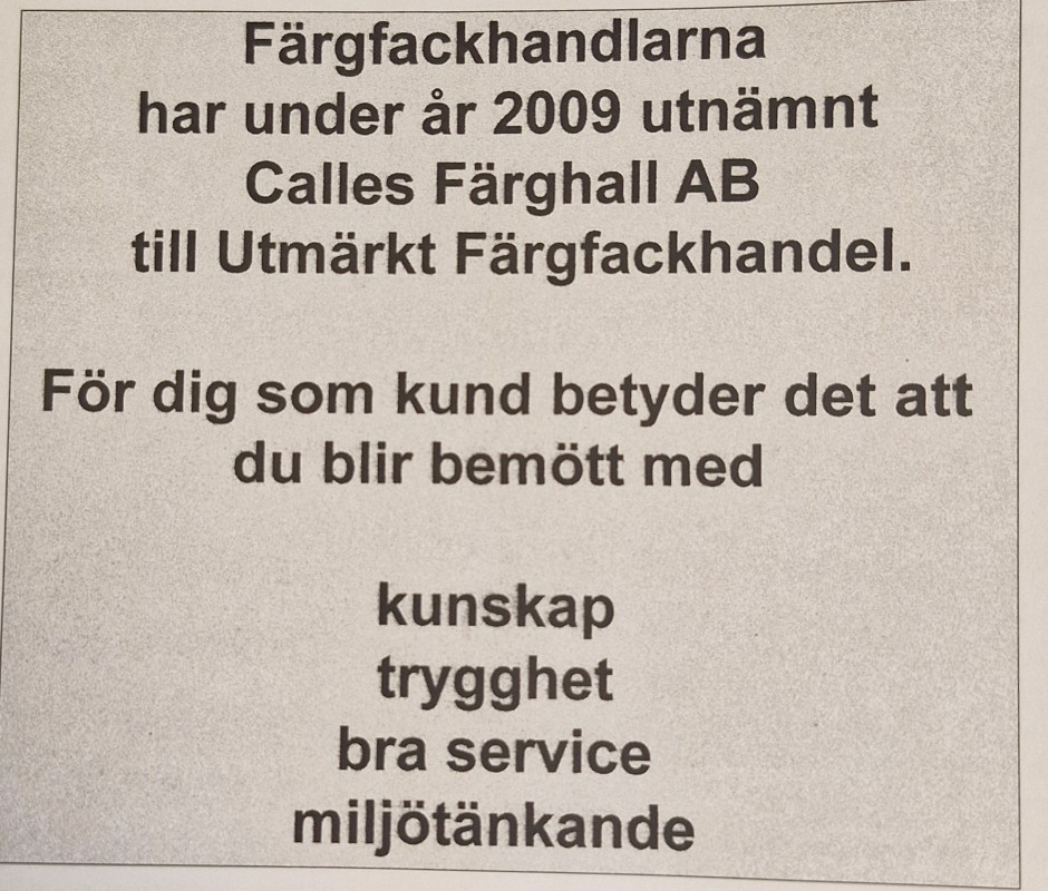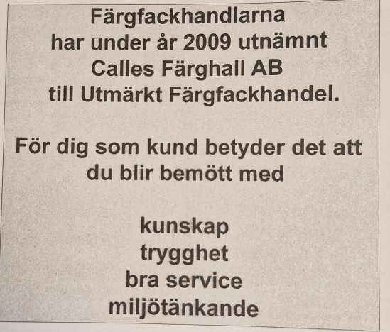 1965 startade Calle Skoogh sin färgbutik Calles Färg i Skillingaryd. Calle hade varit anställd som butiksföreståndare sedan 1948 på Arvidssons färghandel men fick 1965 möjlighet att köpa en färgaffär i Skillingaryd som han då började driva. Då var Kenneth 5 år gammal. Han fick sen (1976) frågan om han ville ta över Arvidssons färg på Ängsgatan i Gislaved och efter lite funderingar bestämde han sig för att göra det. Kenneth tog över efter sin far 1995. Så småningom växte man ur de befintliga lokalerna ,de var ganska tungarbetade. Sveriges lägsta 5-våninghus sa man skämtsamt. Det var mycket spring i trappor för att hämta och bära in varor. 2009 tyckte Kenneth att det var dags för nya lokaler som skulle bli mer ändamålsenliga och man bestämde sig för att bygga en ny butik. Den stod klar i Mars 2010. Vi vill såklart fira att Calles färghall har funnits i 60 år med alla våra kunder. Detta tänker vi göra hela året. Så håll utkik efter det i våra sociala medier.