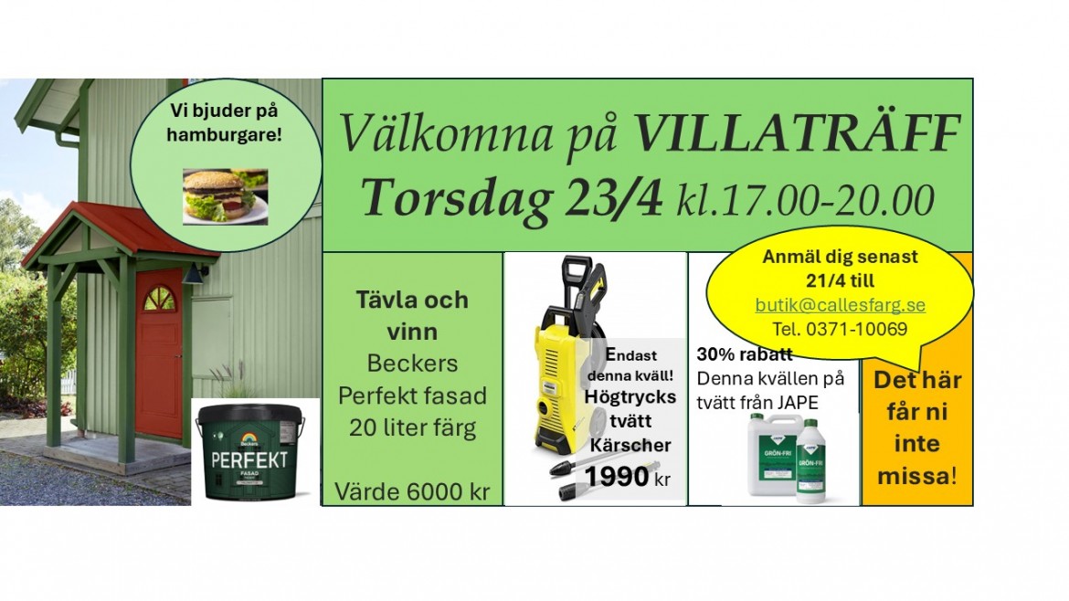 Varmt välkomna till vårens VILLATRÄFF på Calles färg! Vi bjuder på en underbar kväll för dig som gillar att ta hand om ditt hus! Vad händer under kvällen? Bl.a kommer Pär från Kärscher till oss och ...